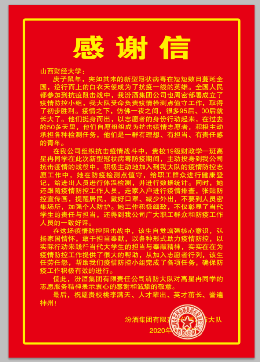 经济学院收到了来自汾酒集团消防大队的感谢信,信中写到:贵校2019级学生高星冉勇于担当,乐于奉献,为疫情防控做了大量的工作,彰显了新时代青年的责任与担当。