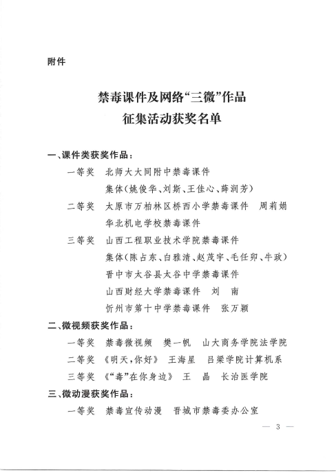 学子刘南制作的禁毒课件荣获了三等奖,并受到了山西省禁毒委员会办公室和山西省教育厅的表彰通报。