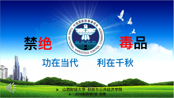 本科2018级财政学一班的学生。提到作品的思路来源,刘南同学表示电影《湄公河行动》是他最大的灵感来源,影片中流露出来的爱国主义情怀,让他忍不住向为禁毒事业献出生命的烈士致敬!课件由湄公河行动导入,围绕禁毒,从认识毒品之源、把握毒品之害、罪恶毒品之思、打赢禁毒战争四个方面入手,分别就毒品的概念和种类、毒品对个人家庭社会造成的危害、对万恶毒品的反思、打赢禁毒战争的历史和现实渊源以及党的十八大以来我国禁毒战争取得的成就进行了详细介绍,警醒大家要严守法律底线,深刻把握党的十八大以来我国将禁毒战争进行到底的决心。