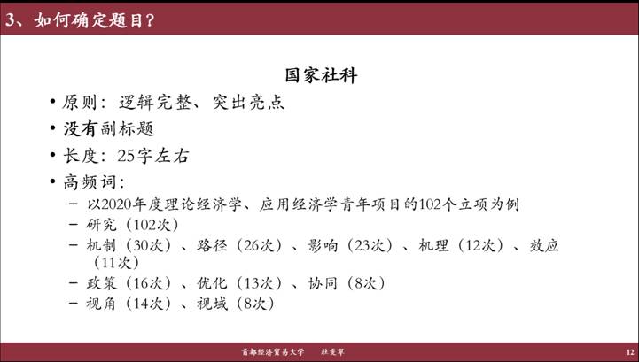再次,对于如何确定一个具体的题目,杜老师针对国家社科基金项目和国家自科基金项目分别从申报具体要求和成功经验总结的角度进行了详细的分析,包括题目的原则、长度、高频词、常见题目的模式以及选择题目的注意事项等问题。