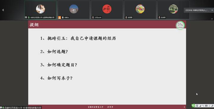 国民经济管理(劳动经济)系主任李春生老师邀请首都经济贸易大学经济学院副院长、博士生导师杜雯翠副教授做了以“如何实现国家级科研项目从0到1的突破”为主题的讲座。讲座以腾讯会议的形式进行,成人视频