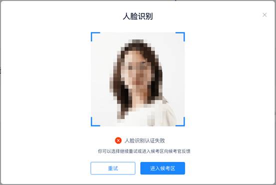 d.      系统对接公安部数据,若认证成功可进入候考区,若认证失败可点击“重试”。若一直认证失败也可进入候考区,但在考官界面会提示“人脸识别认证未通过”,考生须将身份证原件在面试中展示给考官,进行“人证对比”。考试过程中,考官可以查看人脸识别时的截图,确保面试考生是参加人脸识别考生本人,避免替考。
