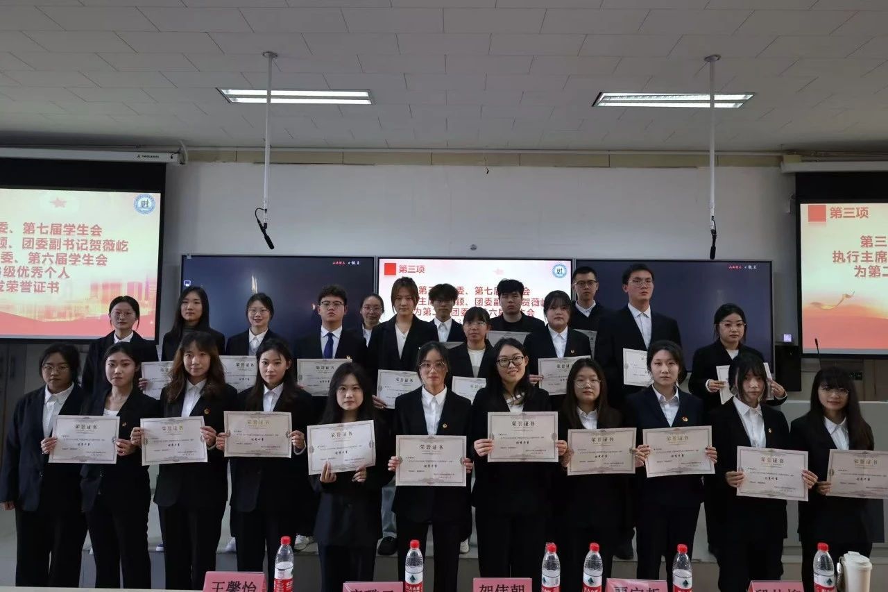 第二届团委第六届学生会主席团成员及优秀个人领取荣誉证书,并宣读了第三届团委第七届学生会成员名单,随后贺伟朝老师为第三届团委第七届学生会主席团成员颁发聘书。