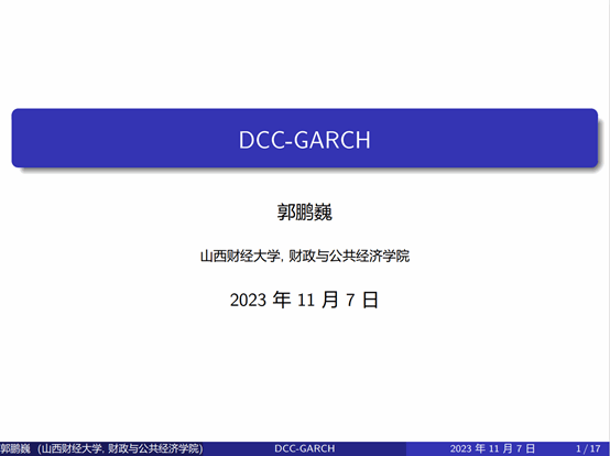 郭鹏巍同学以DCC-GARCH模型推导为主题进行分享,从ARCH和GARCH模型作为导入,引入了动态条件相关系数(DCC),进一步对动态条件相关系数模型的形式、类别以及优缺点进行了深入的分析,为大家展示了完整且全面的公式推导过程。康老师对于郭鹏巍同学的理论研究给予了肯定,表示自己也从中有所收获,并为同学们的毕业论文选择方向提出了宝贵的建议。