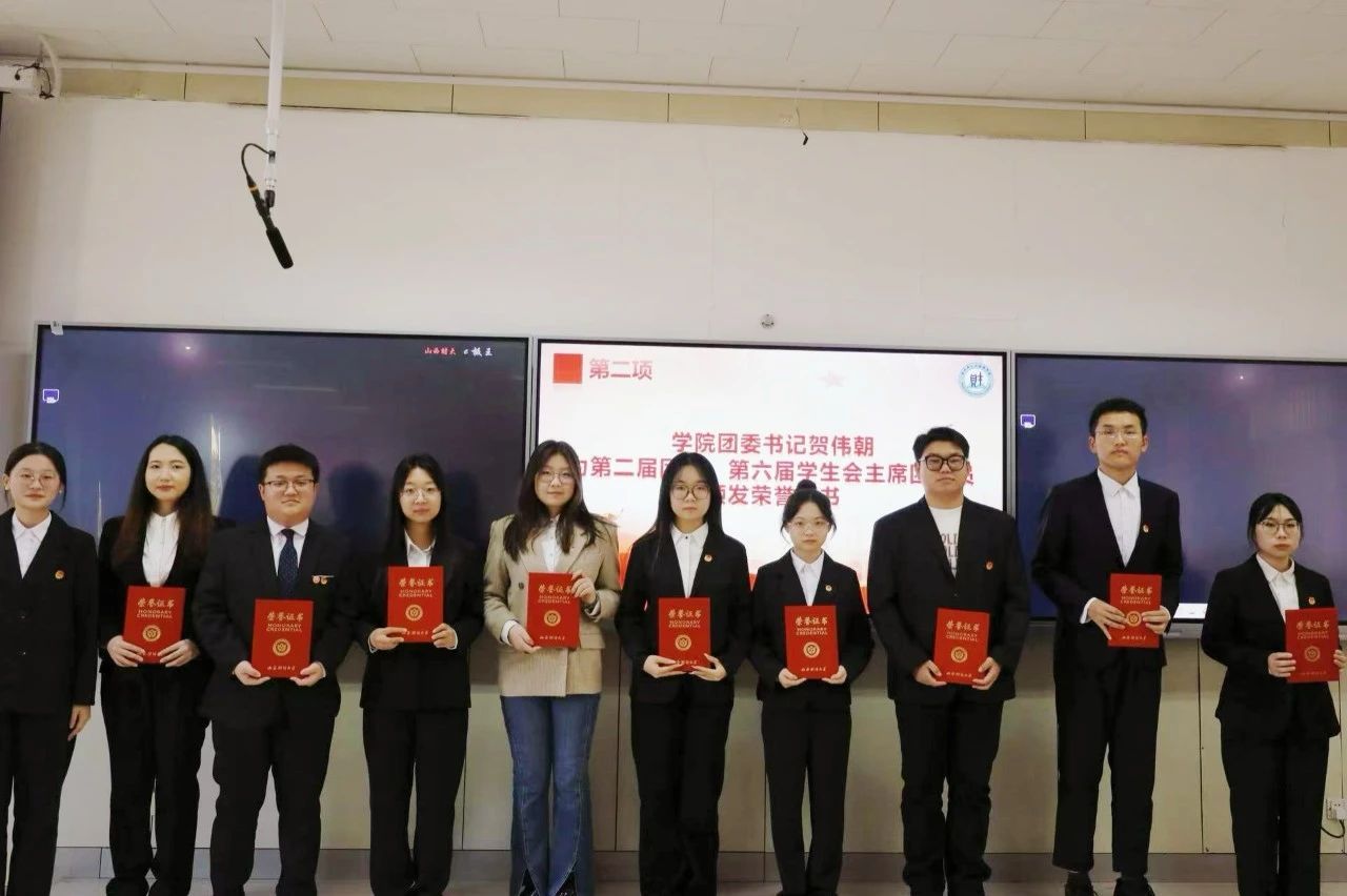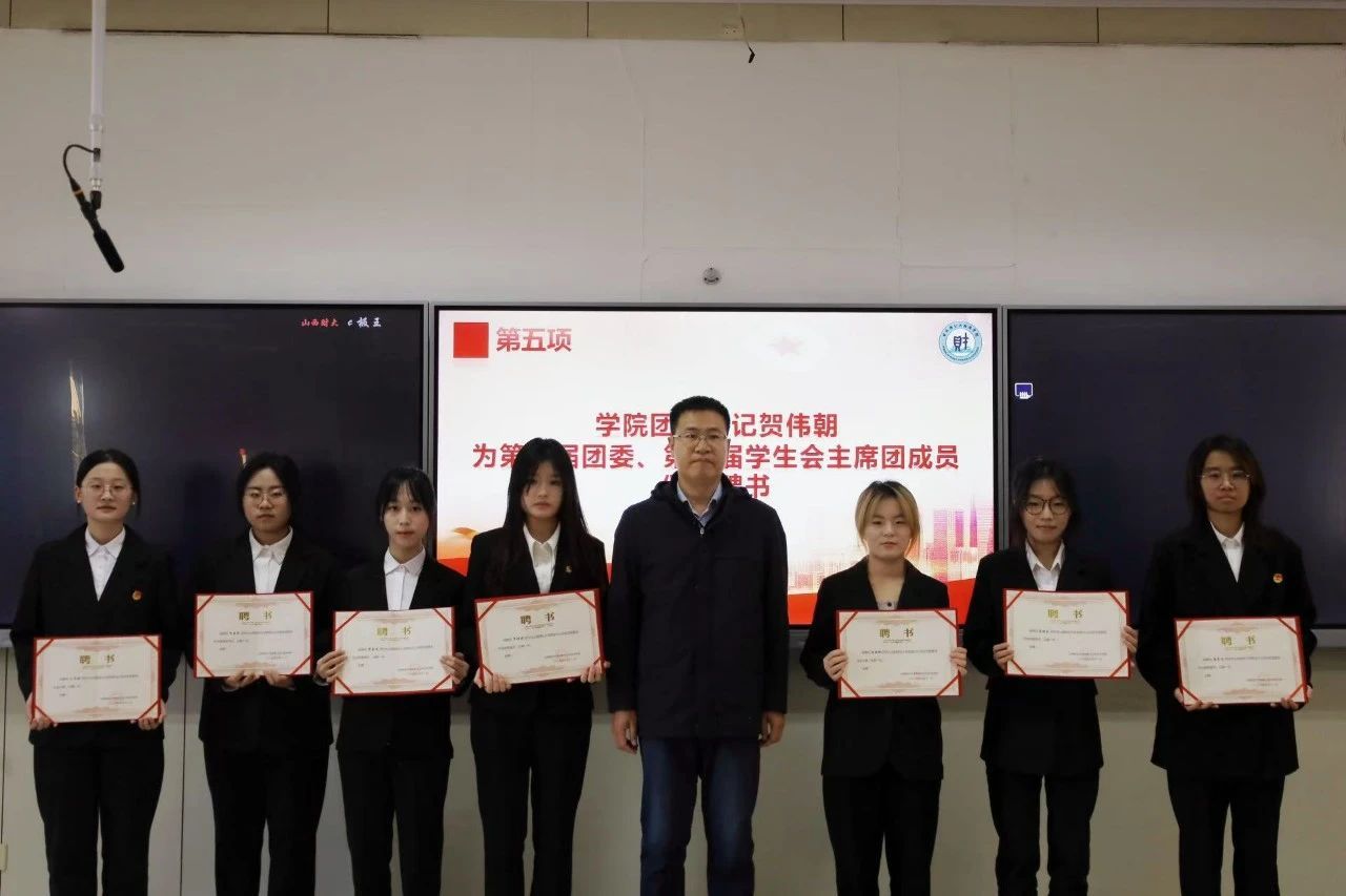 第二届团委第六届学生会主席团成员及优秀个人领取荣誉证书,并宣读了第三届团委第七届学生会成员名单,随后贺伟朝老师为第三届团委第七届学生会主席团成员颁发聘书。